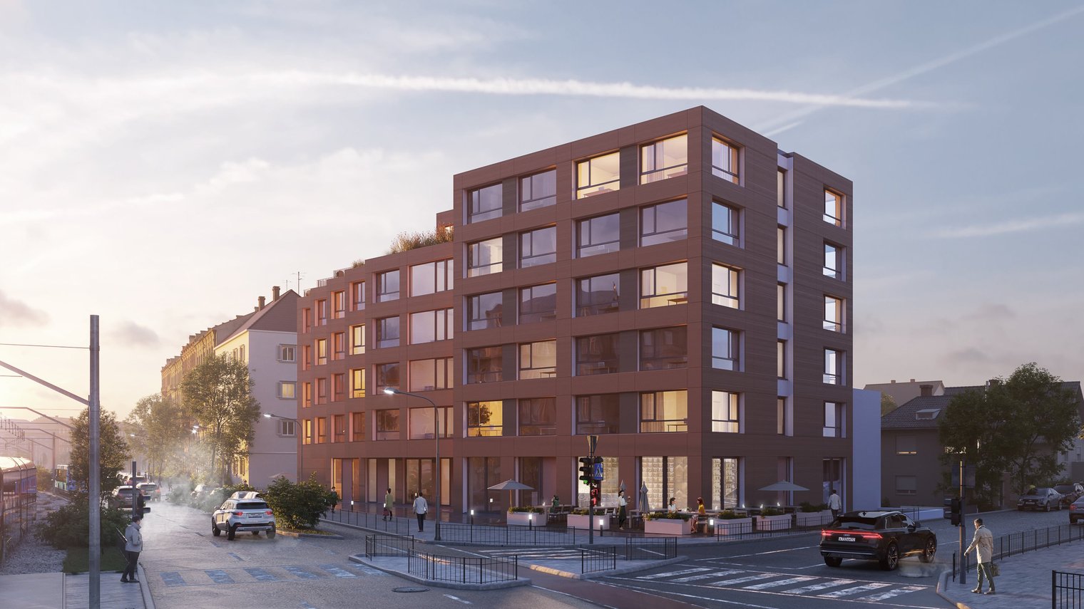 Die Obergeschosse werden in der Massivholzbauweise realisiert, der weitere Großteil des Gebäudes besteht ebenfalls aus Holz. Die vorgefertigten Bauelemente und die Standardisierung der Apartments tragen dazu bei, den Aufwand vor Ort klein zu halten und den steigenden Materialkosten entgegenzuwirken.